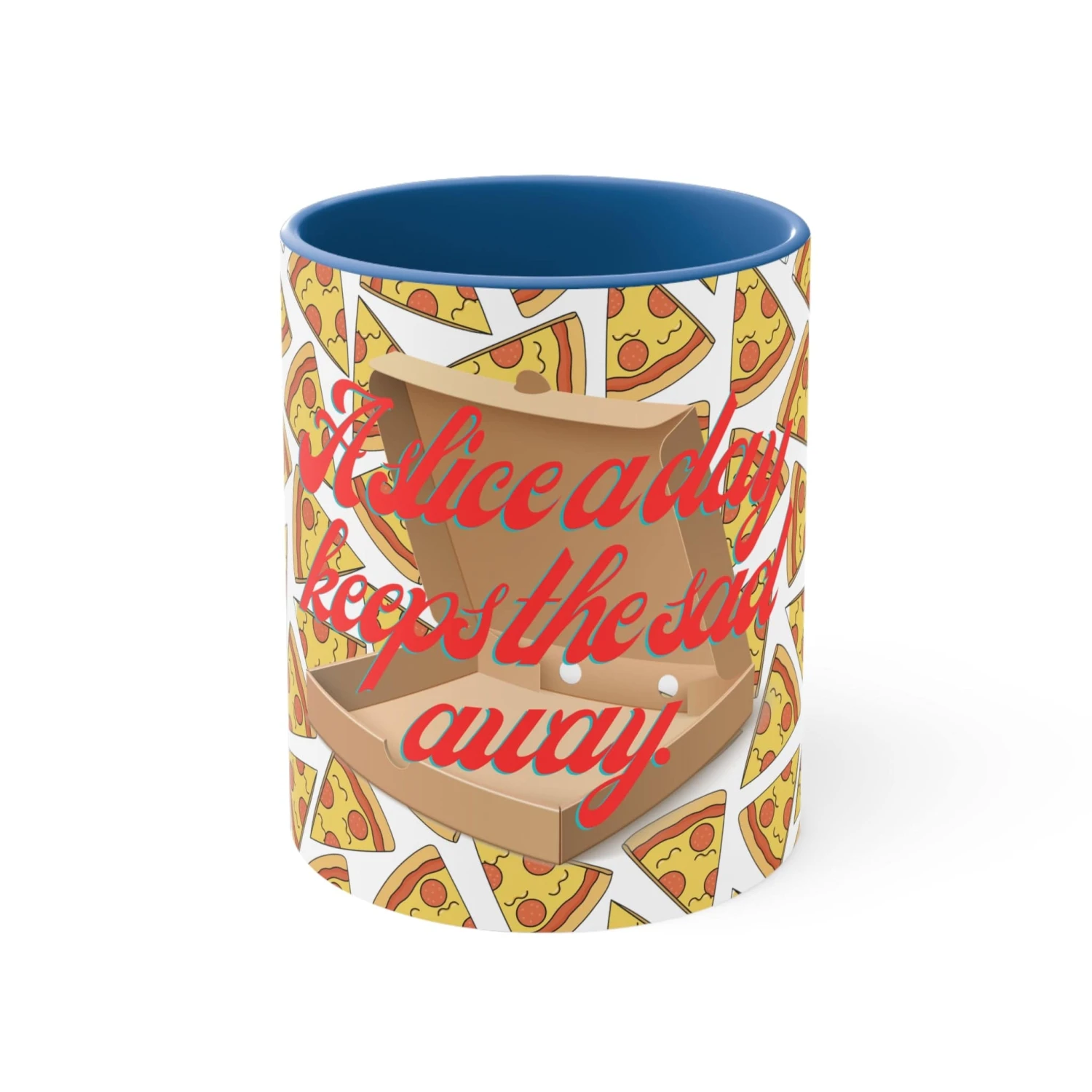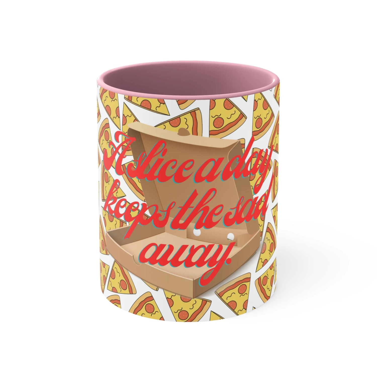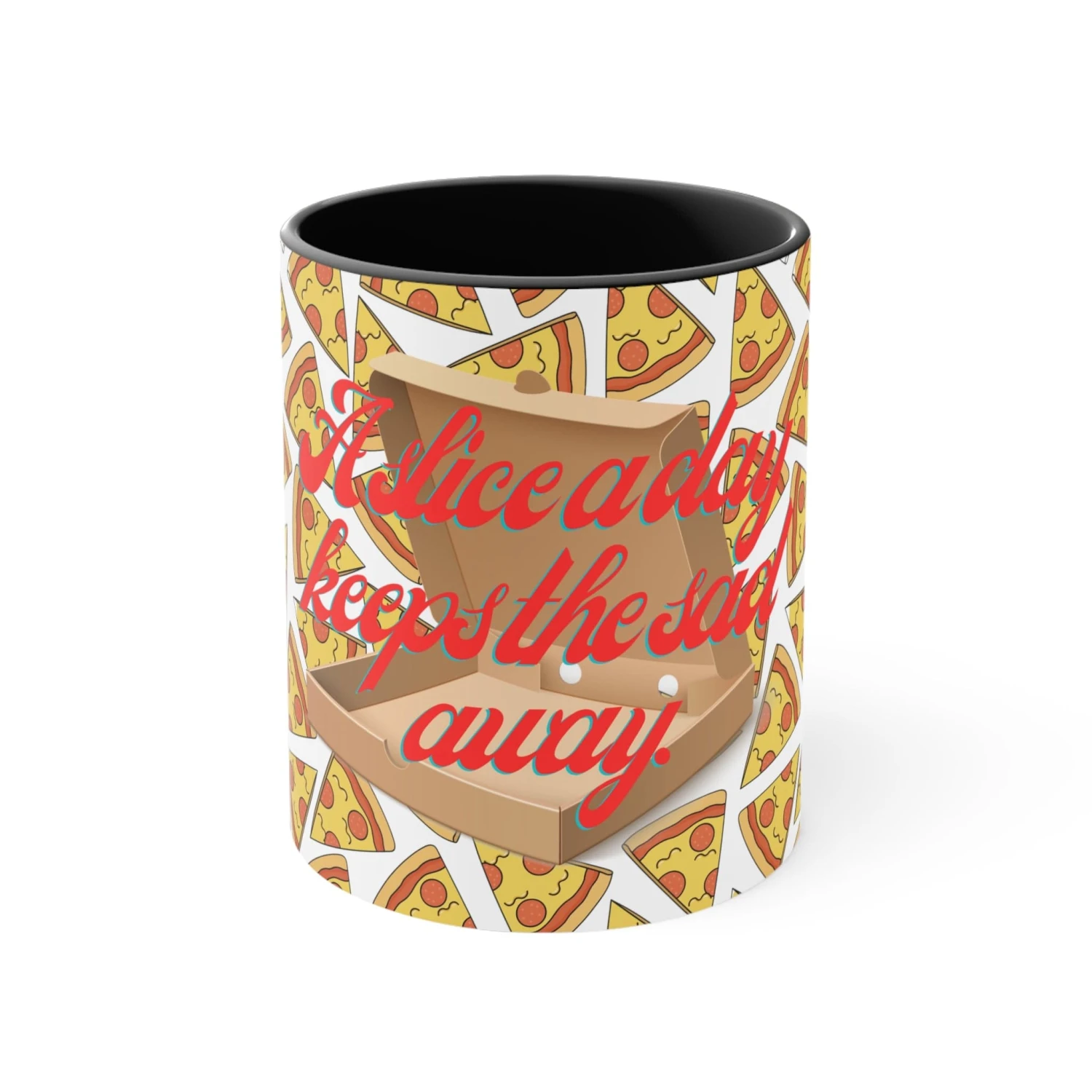 Introducing our commical “A Slice A Day Keeps The Sad Away” 11 oz ceremic mug with a colorful twist – because who said your morning coffee or evening tea can’t be a little more fun? With a vibrant colored interior and handle, an outside design featuring a playful pizza pattern and the motivational mantra “a slice a day keeps the sad away,” this mug is sure to brighten up your day with every sip while helping convince those around you that pizza is always the perfect choice for any meal.