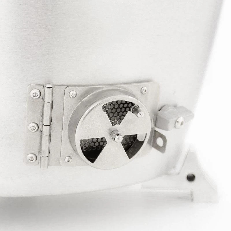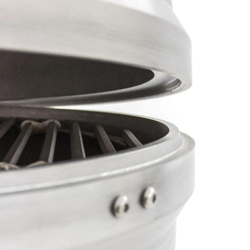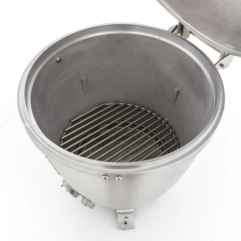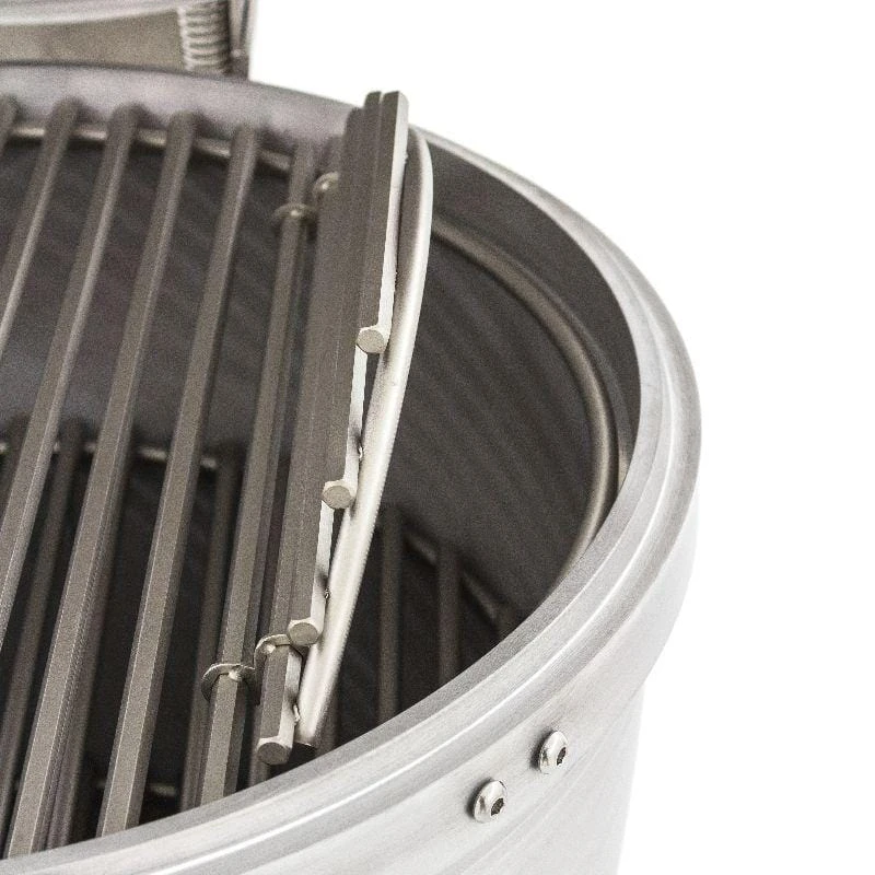 Pre-installed lid hinge with lift assist allows for easy burping and opening of the kamado.