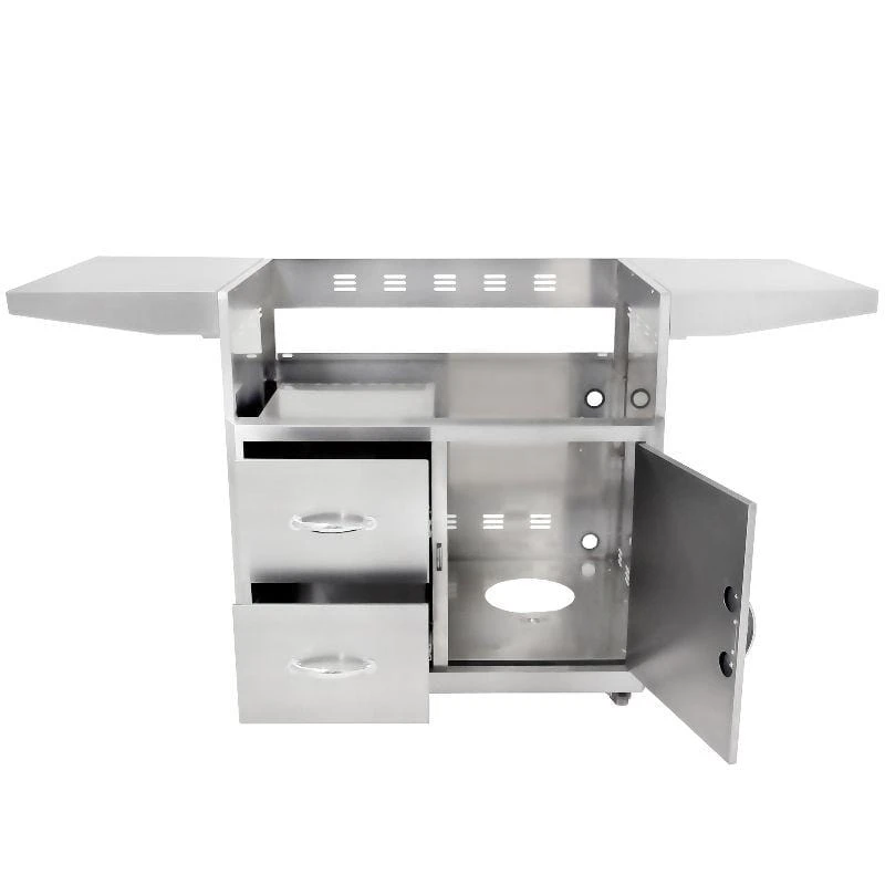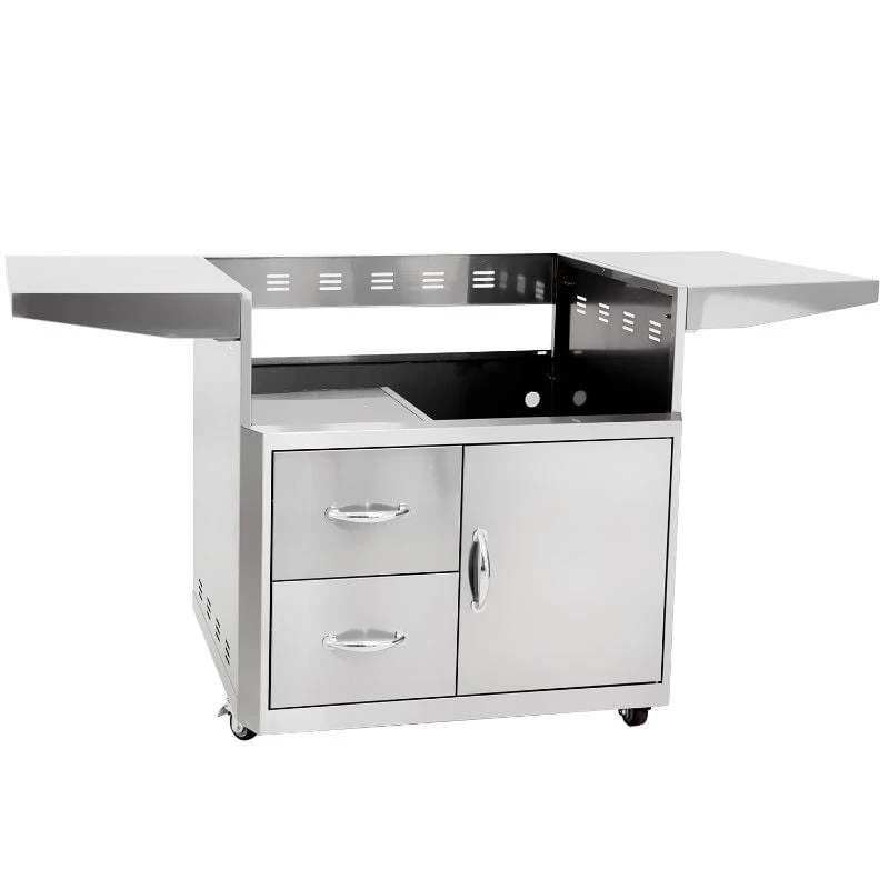 This Blaze stainless steel grill cart is specifically designed to house the Blaze Professional 3 burner gas grill. The two stainless steel side shelves keep your BBQ tools at hand and provide a convenient work area while you cook.