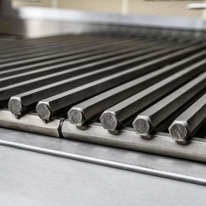 12mm thick cooking rods absorb heat, producing deep sear marks.