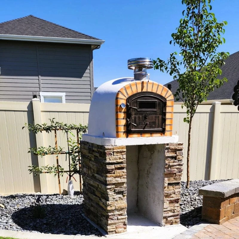 The Lisboa Brick Pizza Oven PREMIUM boasts premium hardware, including a black NON-RUST CAST ALUMINUM door, chimney cavity, and STAINLESS STEEL chimney. The door features a peep-through high-heat viewing window, providing a glimpse into your culinary creations. The door on the Premium Lisboa Oven opens from left to right and is split like a barn/Dutch door.