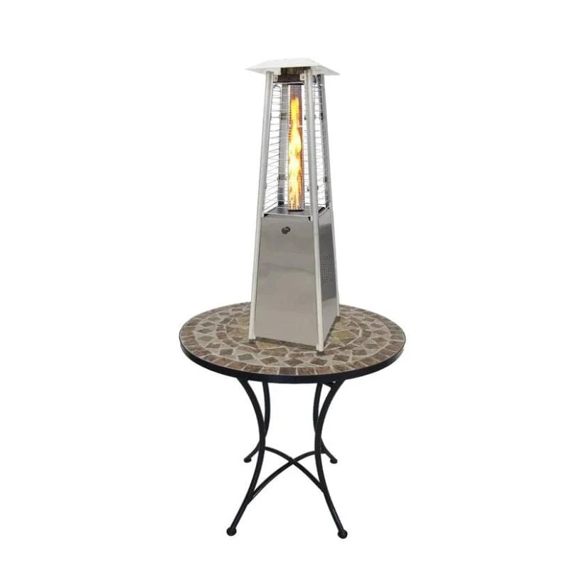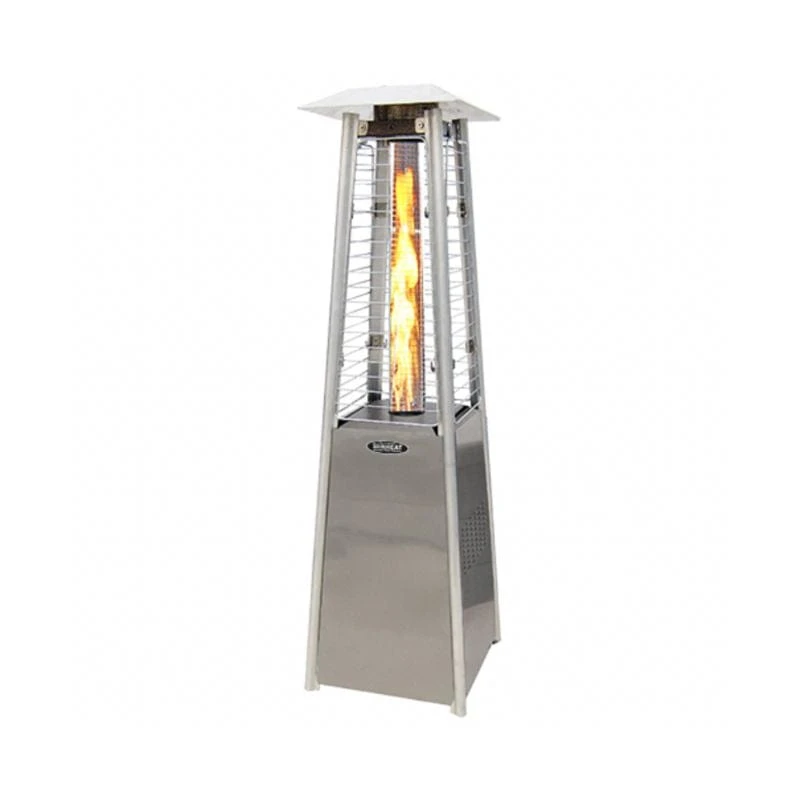The Original SUNHEAT Restaurant quality patio heater in a golden hammered finish features a contemporary square design and a decorative variable flame to heat up any outdoor gathering. The unique pyramid shape provides functionality and style that will warm and accentuate your patio or deck. The enchanting flame will safely light up the night as it dances inside a glass tube. The 8.5 inch triangle reflector hood evenly spreads the 11,000 BTUs of heat across your outdoor space, up to 5 feet in diameter.
