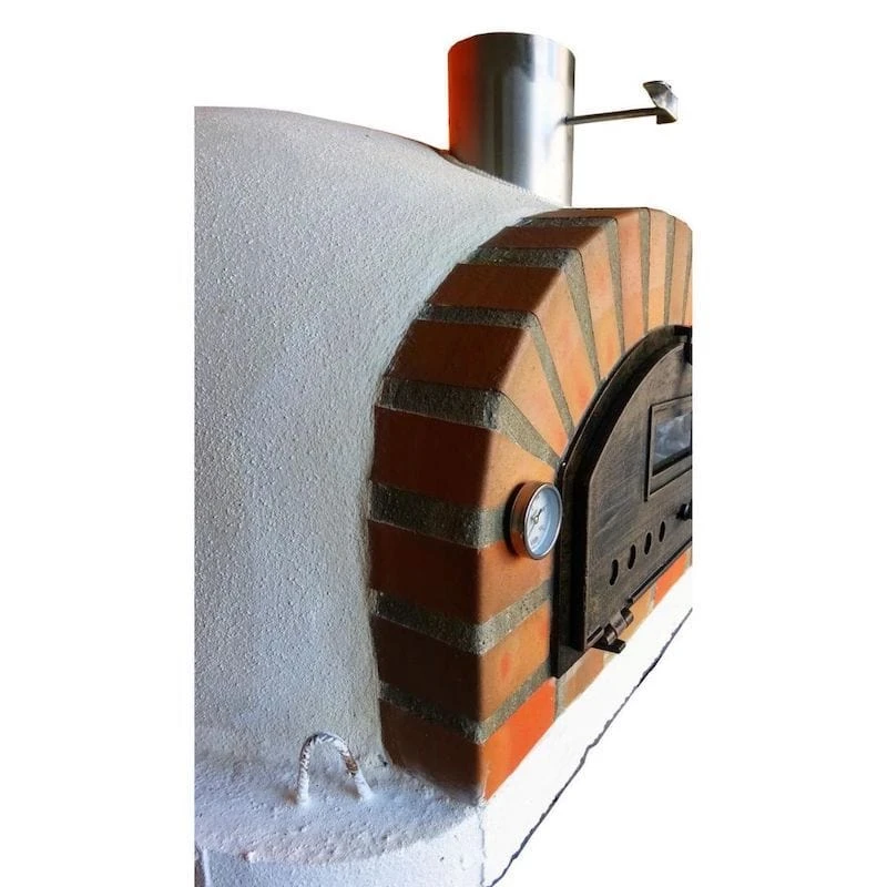 The Pizzaioli Rustic Arch Brick Pizza Oven boasts premium hardware, including a black NON-RUST CAST ALUMINUM door, chimney cavity, and STAINLESS STEEL chimney. The door opens down and has a peep through high heat viewing window pane that allows you to see the food you are cooking.
