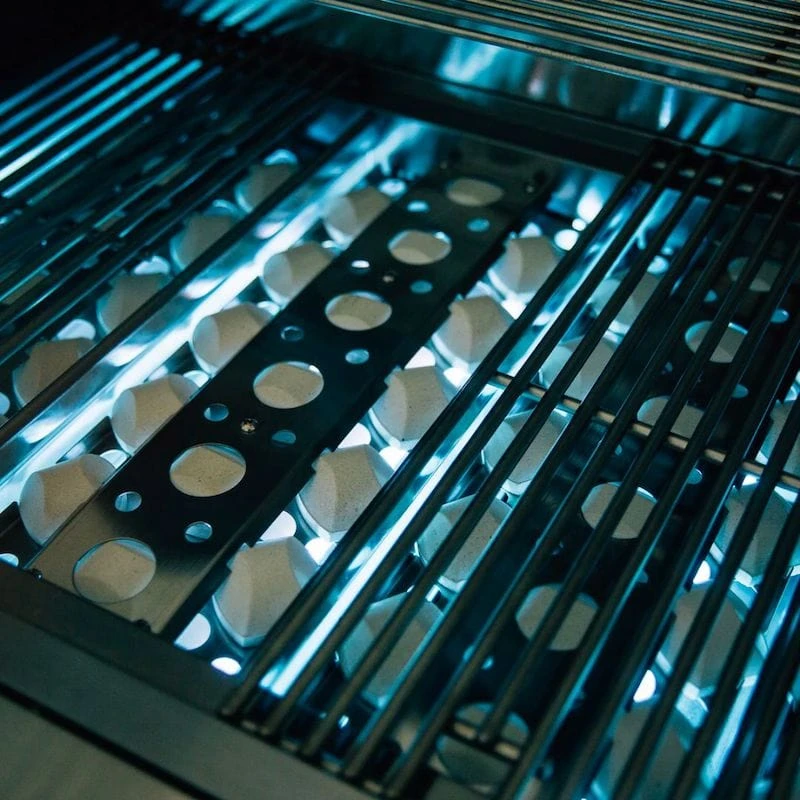 | | LED Pin Lighting + White to Red Bezel Lighting Indicating ON/OFF Burner State | | Interior Halogen Cooking Lights | | 696.57 Sq. In. Cooking Surface – | | Main Burner 14,000 BTUs (each burner) |