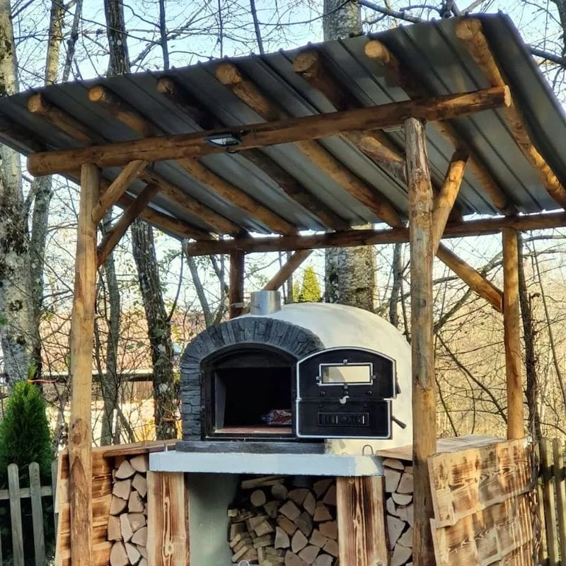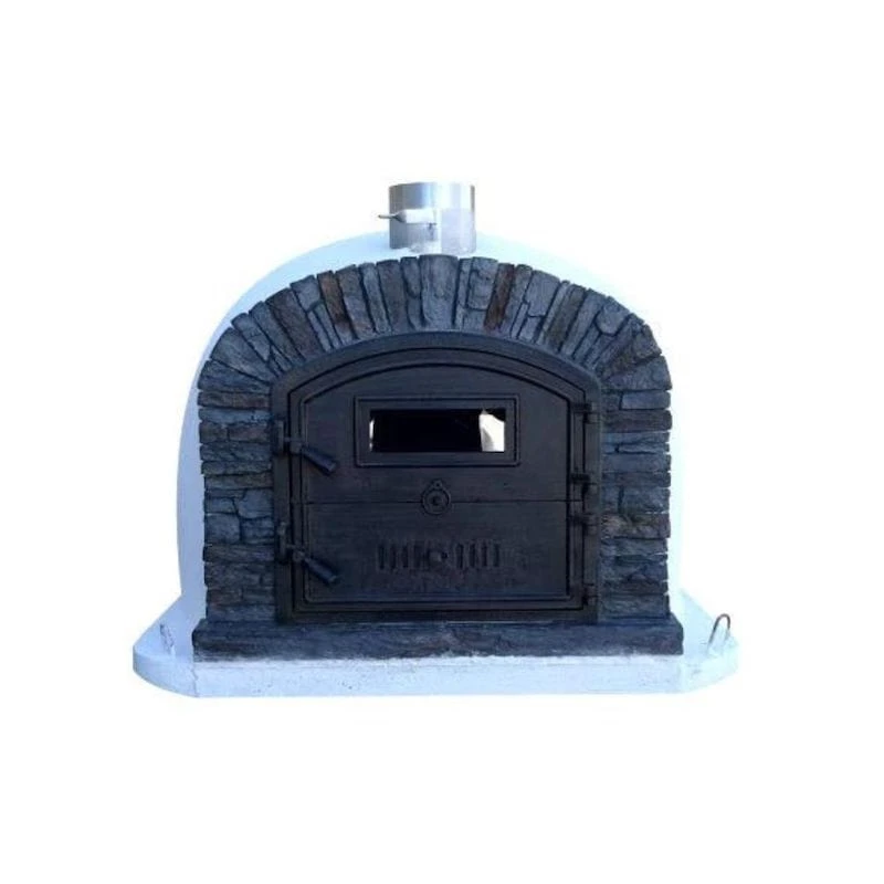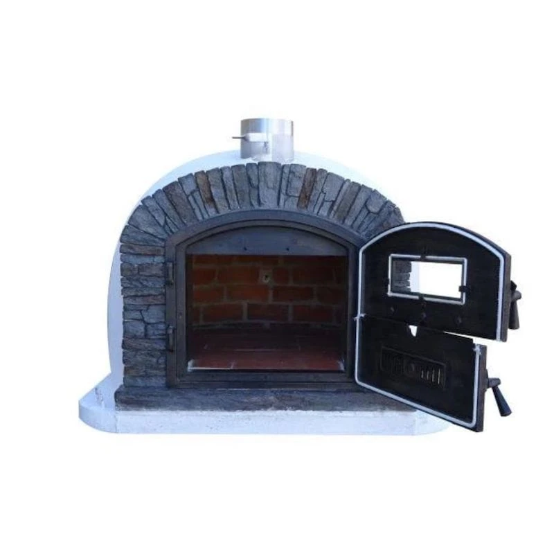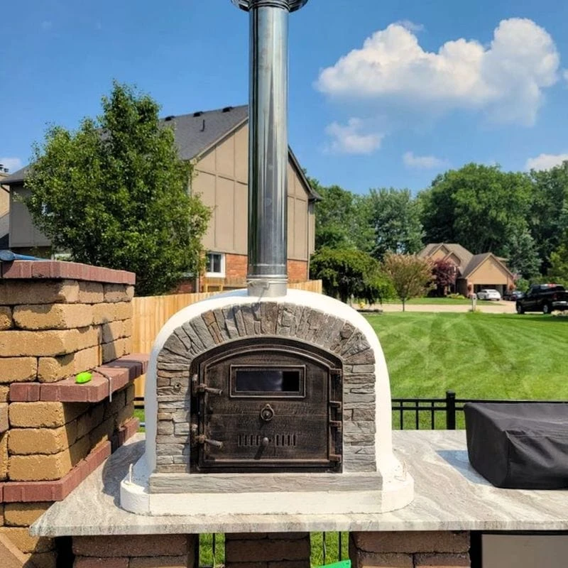 The Ventura PREMIUM Preto Brick Pizza Oven boasts premium hardware, including a black NON-RUST CAST ALUMINUM door, chimney cavity, and STAINLESS STEEL chimney. The door features a peep-through high-heat viewing window, providing a glimpse into your culinary creations. The door on the Ventura Premium Oven door opens from left to right and is split like a barn/Dutch door.