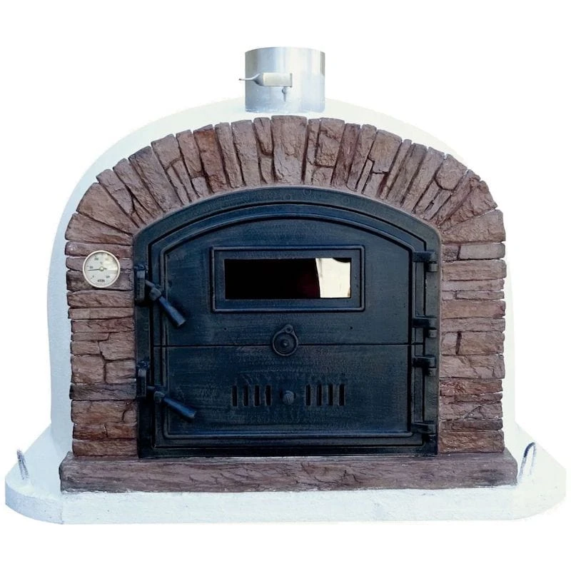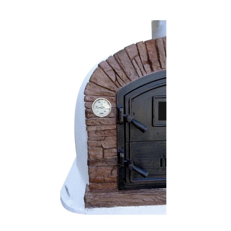 The Ventura PREMIUM Sierra Brick Pizza Oven boasts premium hardware, including a black NON-RUST CAST ALUMINUM door, chimney cavity, and STAINLESS STEEL chimney. The door features a peep-through high-heat viewing window, providing a glimpse into your culinary creations. The door on the Premium Ventura Oven door opens from left to right and is split like a barn/Dutch door.